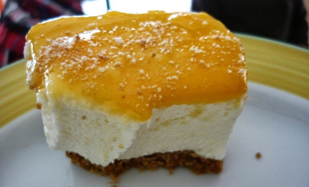 Se for para o próprio dia, coloque umas horas no congelador e antes da altura de servir passe para o frigorífico. Deitei o doce de ovos por cima. Polvilhei com bolacha e levei novamente ao frio.